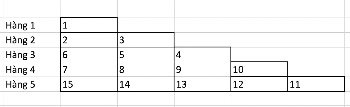 - Hàng thứ k có đúng k ô, đánh số liên tiếp bắt đầu từ 1.